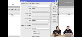 Untuk akses jaringan LAN, buat bridge lagi dengan cara bridge > + > Name : bridge-LAN > Ok.